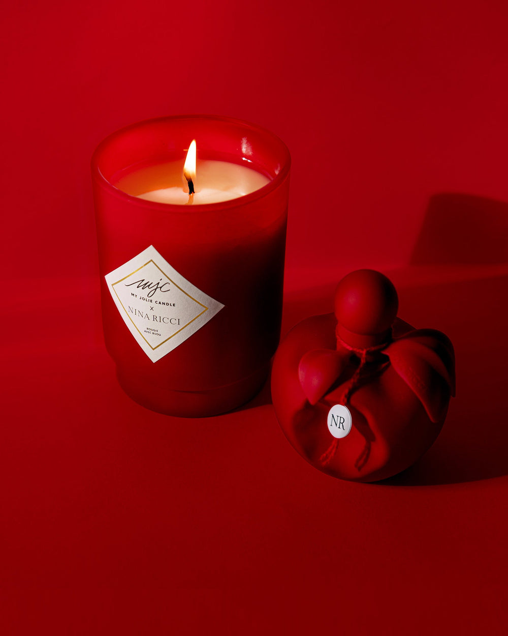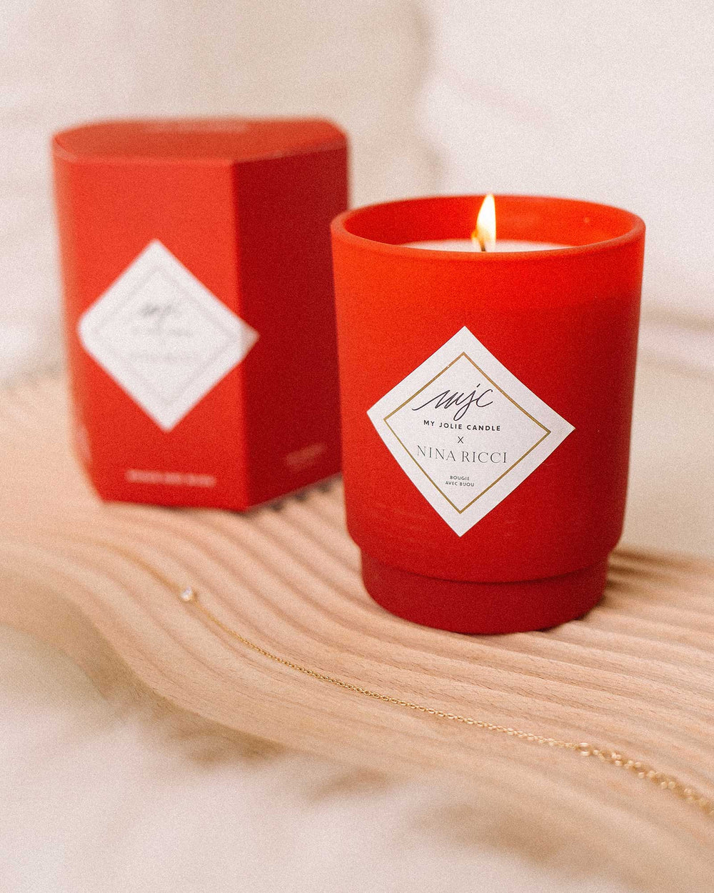 La rencontre du parfum Nina Extra Rouge et du savoir faire My Jolie candle : une cire 100% naturelle à base de soja, mangue et coco parfumée dans nos ateliers de Grasse, puis une mèche en coton pur, garantie sans plomb.